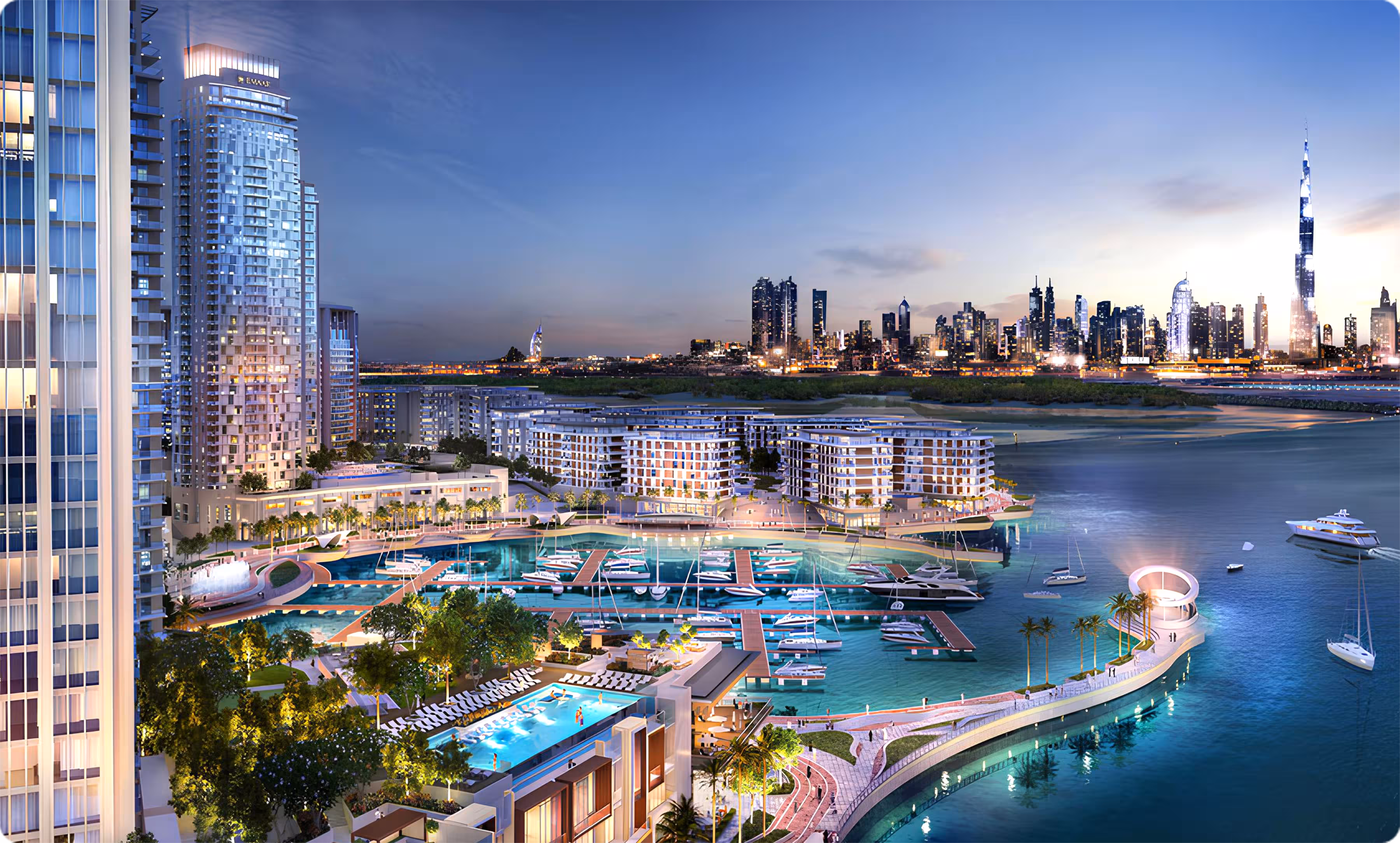 A master-planned waterfront district with marinas, a Creek promenade, and the upcoming Dubai Creek Tower. Pedestrian-friendly boulevards, landscaped parks, cafés, and retail clusters line the waterfront.